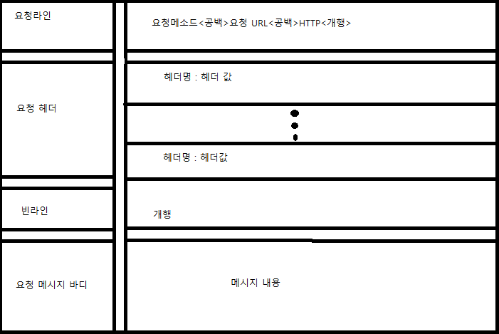 - 요청 라인 : 한 행으로 구성되며 요청 메소드, URL, HTTP 버전 정보를 담고 있다.
