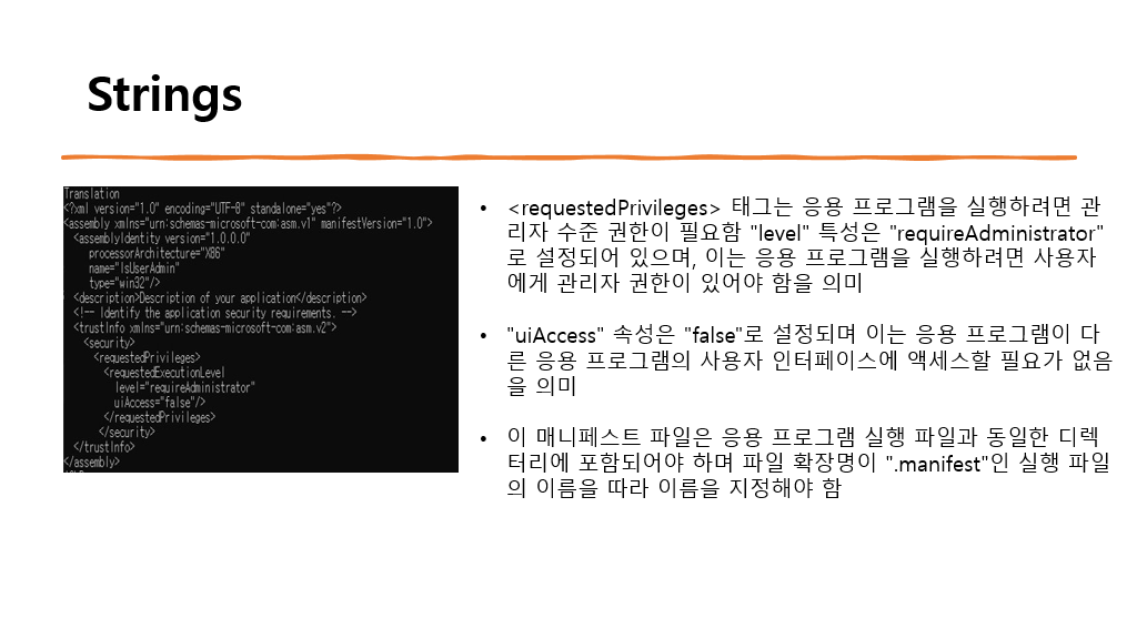 - 하지만 Strings의 결과로 볼 때 관리자 권한을 요구하고, 외부 파일을 허용 하지 않는 등 백신 우회를 위한 코드로 보임