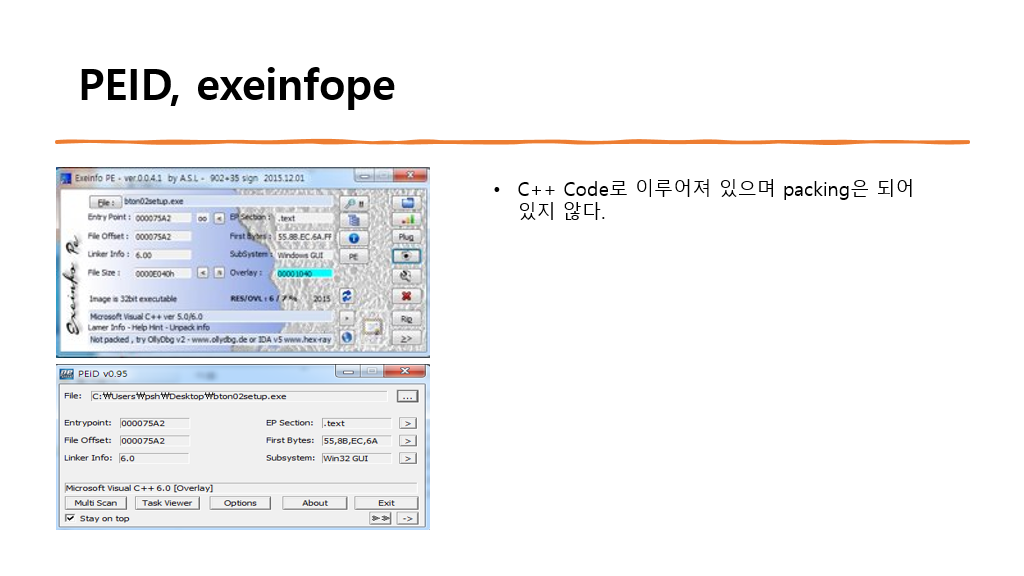 - 파일을 만드는 데 사용되는 컴파일러와 패커를 식별하는 데 사용할 수 있는 도구