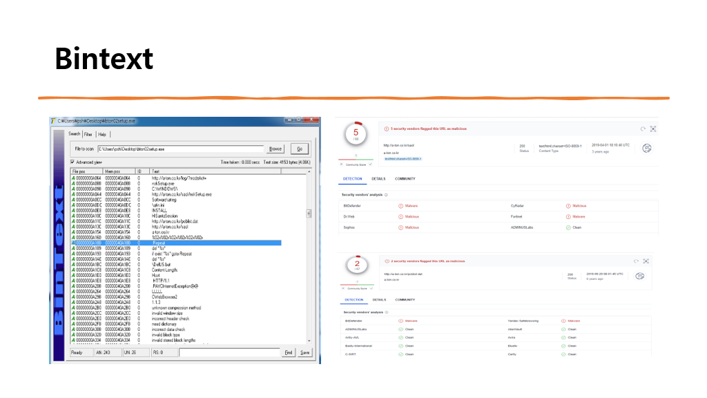 - Malware에 대한 파일을 분석할 때 BinText를 사용하여 파일의 목적 또는 기능에 대한 정보를 포함할 수 있는 파일에서 문자열을 추출할 수 있고, 이곳에는 파일 경로, 네트워크 주소, CLI 인수 및 파일 동작을 식별하는 데 사용할 수 있는 기타 데이터와 같은 정보가 포함된다